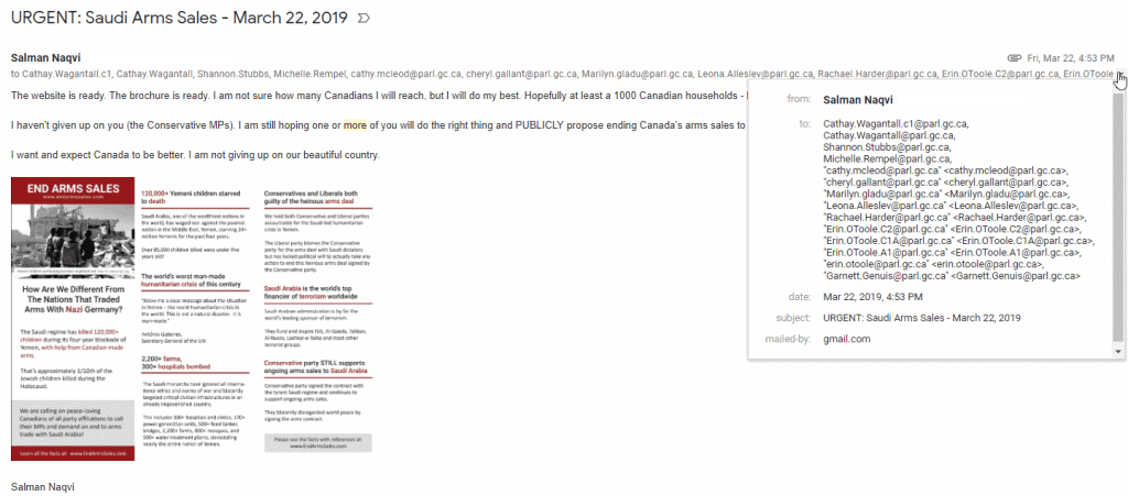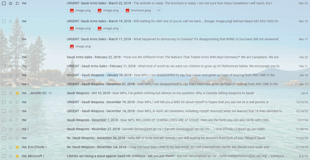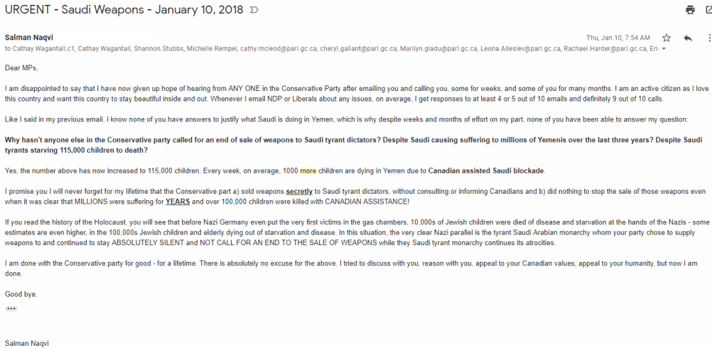 To be fair, I called Liberal and NDP MPs too. I ALWAYS heard back from them. Some took a few weeks to respond, but, they did respond. They diverted the blame for the deal on the previous Conservative government. Liberals have, at the highest levels, including Trudeau himself, spoken out against the deal, but, all they’ve done is pay lip service as they’ve continued to allow sales of weapons to Saudi Arabian dictators throughout their majority and minority governments so far.